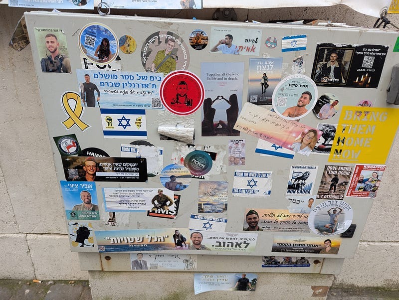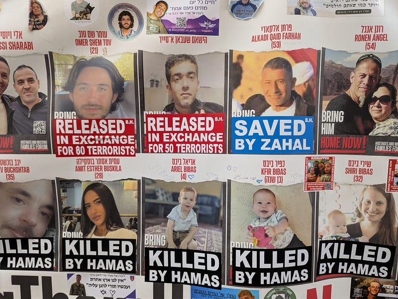 I was in the traditional Jewish neighborhood — the ghetto, that is — and the first thing I saw was an extraordinarily long poster of all the hostages. Their fates, where known, were updated with explanations.